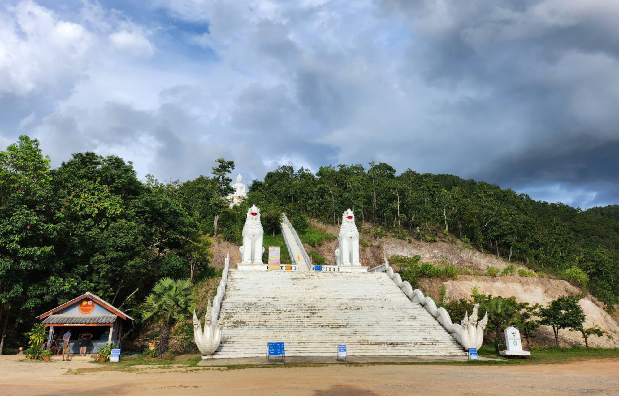 แต่ที่โดดเด่นของวัดพระธาตุแม่เย็น คือ พระพุทธโลกุตระมหามุนี พระพุทธรูปปางมารวิชัยสีขาว ที่ตั้งตระหง่านอยู่บนเนินเขาเหนือวัดขึ้นไป ซึ่งต้องขึ้นบันไดไปราว 300 กว่าขั้น เพื่อไปสักการะองค์พระใหญ่ที่ด้านบน และยังสามารถชมวิวเมืองปายแบบ 360 องศา ที่จุดชมวิวด้านบนได้อีกด้วย จะมองเห็นทิวทัศน์ได้ทั่วทั้งอำเภอปาย และหากได้ขึ้นไปในตอนเย็นจะได้ชมพระอาทิตย์ตก โดยมีเทือกดอยจิกจ้องเป็นฉากหลังที่งดงาม