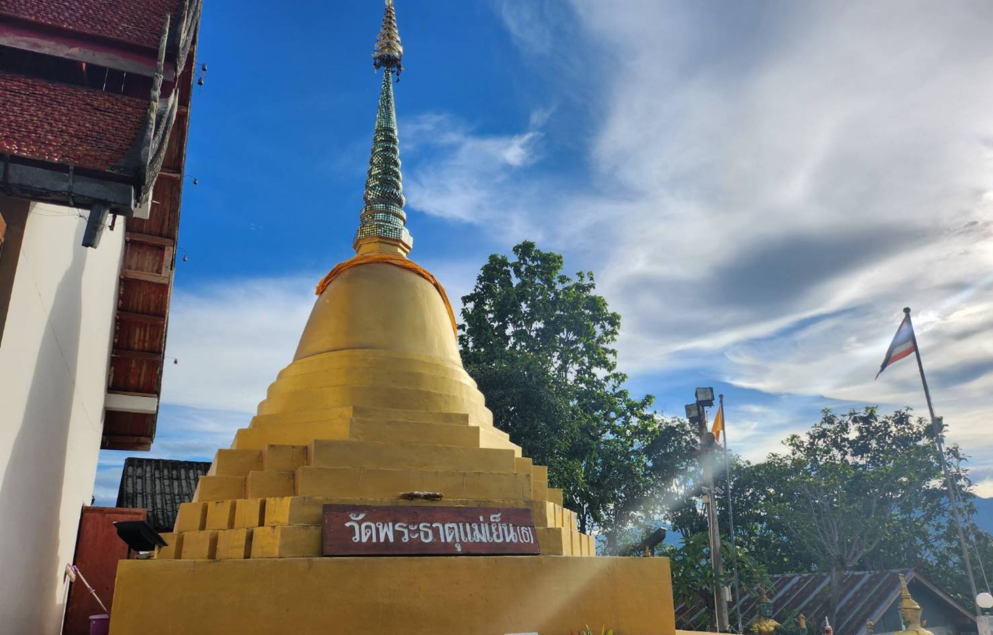 เจดีย์พระธาตุแม่เย็น สูงประมาณ 3 เมตร ยอดฉัตรแบบเจดีย์พม่า เป็นเจดีย์ทรงระฆังสีฐานกลม ก่ออิฐถือปูนฉาบด้วยสีทองอร่ามเรืองรอง และเป็นพระธาตุเก่าแก่ที่ชาวเมืองปายให้ความเคารพศรัทธาอีกด้วย